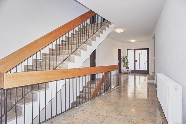 Ziegelbauweise, Lift, helles Treppenhaus mit großen Fensterflächen.